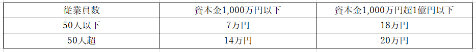 また資本金が1,000万円以下ですと、以下のように住民税の均等割も安くなります。以下は東京23区に本店を置く会社の例となります。