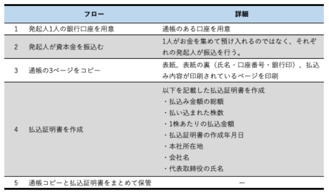 会社設立時の資本金払込とは?やり方と注意点」) 注意点としては、2つ目の手順「資本金の振込」のところで発起人それぞれが自分の口座から資本金を集める口座に振込を行いましょう。そうすることで発起人それぞれが資本金を支払った裏付けとなります。 また払込証明書や通帳コピーは後から必要になることもあるので、設立の時点でしっかりと作成しておく必要があります。