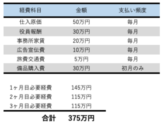 ここまでの内容で資本金と節税や融資の関係、そして払込みのフローを理解できたと思います。ここでは最後に、資本金として適切な額の計算例を確認しましょう。 以下は例となる会社の1ヶ月あたりの想定経費です。