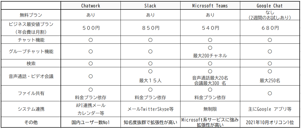 チャットツールはどれが良い?Slack、Chatwork、Google Chat、Microsoft Teamsを比較 経営お役立ち情報 2021.12.16 近年では、ビジネスにおいてメールのほかにもチャット形式で連絡を取ることも出来るようになってきました。特にリモートワークでは、チャットツールのレスポンスの手軽さと早さは業務効率化の一因になってきています。そのような背景から、チャットツールの運営会社もセキュリティ強化や機能の拡充を行っており、アップデート等により品質が向上してきています。 今回は、複数あるチャットツールの中でも代表的な4つのチャットツールを解説、比較していきます。 チャットツールの種類と特徴 基本性能はどのツールも大差はありませんが、細かい機能が異なりますので、それについては後述する個別の特徴をご覧ください。 チャットツールは種類も多く、選定が非常に難しいため、次の表では、基本性能はどれも変わらないことと値段の違いを把握して頂ければと思います。 Chatwork 概要 国内利用者数No1を誇るチャットツールとなっており、運営会社も日本国内にあります。そのため、日本人向けに機能が備わりながらも、英語・台湾語・タイ語・ベトナム語・スペイン語の6か国語にも対応しており、外資系との連絡としても有用です。 チャットツールとしては海外ならSlack、国内ならChatworkと言われるほどの知名度となります。(導入事例:大日本印刷、GMOインターネット、サイバーエージェント) 特徴 タスク管理が非常にしやすいことであり、他者からのタスクを受けることも可能のため、チャットツール兼タスク管理ツールとしても使用できます。また、社外の方のアカウントの追加も容易なため、外注先や営業先にも使いやすい特徴があります。 Slack 概要 Slackはアメリカ発のチャットツールとなっており、元々はゲーム開発者向けに作られたこともあって、使用者はエンジニアやベンチャー企業系が多くなっています。しかし、現在では2019年時点でデイリーアクティブユーザーは1200万まで増加しており、外資系企業や中小企業でも導入され始めています。(導入事例:DeNA) 特徴 外部から連携できるサービスが2200以上(2021年時点)あり、各種SNSやカレンダーなどのアプリケーションから通知やSlack上に自動投稿するような設定が可能です。 また、元々のターゲットからエンジニア向けにプログラミングのコードを共有する機能があるため、開発を重ねるエンジニアから注目を浴びています。 Google Chat 概要 Googleといえば検索エンジンを始め、Googleドキュメントや、スプレッドシートなどのデータの共有に強みを持っている企業です。細かい説明は省略しますが、2021年に一般ユーザー向けにリリースされており、比較的新しいサービスとなります。以前はHangouts Chatという名称でリリースされていましたが、度重なる方向転換の末現在の名称になっています。(導入事例:帝国ホテル、ビッグローブ、森ビル) 新しくリリースされただけあって、機能の拡充が著しく行われており、2021年12月にはGmailアプリでGoogle Chat機能である音声・ビデオ通話ができるようになりました。 特徴 Googleのサービス連携が非常に使いやすく、導入のハードルが非常に低いツールとなっています。メールとチャットの垣根がなくなってきた今日ではGmailと同画面でGoogle Chatが使用できる点が使いやすさの点で評価されています。さらには、2021年10月のオリコンランキング【ビジネスチャットツール】部門において第1位を獲得しているため、信用度も上昇しています。 Microsoft Teams 概要 ビジネスツールの標準ツールとして扱われているExcel、PowerPoint、Word、Outlook、Accessを開発しているMicrosoftからリリースされているチャットツールです。開発企業だけあって、Google系のビジネスツールよりも共有がし辛いExcelなどの共同編集が安易にできるようになっています。(導入事例:IKEA) 特徴 各種Microsoft系のソフトを社内でヘビーユーズしているのであれば選択肢に入るツールの一つであり、Microsoft365のライセンスに付随しているツールのため、既に契約している企業であれば導入コストがかからないメリットがあります。さらに、Microsoftは多言語にも対応できるように約40か国語に対応しているため、グローバル企業にとっては非常に有用になります。また、操作のしやすさは他のチャットツールに遅れをとる印象を受けますが、拡張性に優れているため少しずつ自分好みに使いやすくできることも特徴になります。 どれを選べばいいか どれも似た性能を持っていますが、簡潔にそれぞれの特徴から選ぶのであれば 国内での使用のみ、タスク管理、手軽さやコストを抑えるならChatwork 拡張性重視、外資系企業やエンジニアとの連絡がある場合はSlack オリコン1位の扱いやすさや、Google系ソフトの共有等があればGoogle Chat 拡張性により好みに仕上げたい、Office系ソフトの共有等があればMicrosoft Teams 気をつけたいのは社内のみで使うツールなのか、それとも社外とも連絡を取る