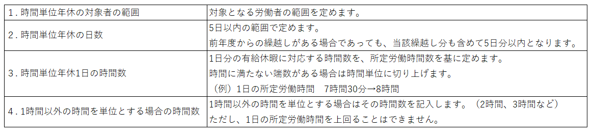 有給休暇の付与は原則1日単位ですが、労使協定を締結することにより、年5日の範囲内で、時間単位の取得が可能となります。 時間単位の有給休暇制度を導入する場合には、就業規則による規定と労使協定の締結が必要になります。労使協定で定める項目は以下の通りです。