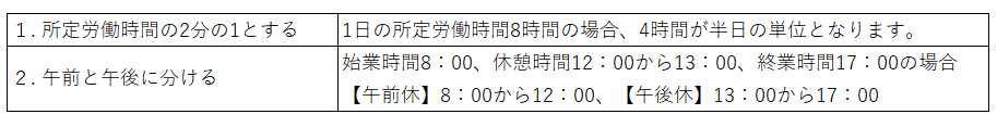 有給休暇の付与は原則1日単位ですが、労働者が半日単位での取得を希望して時季を指定し、使用者が同意した場合であれば、労使協定が締結されていない場合でも、1日単位取得の阻害とならない範囲で、半日単位で与えることが可能です。 半日単位の有給休暇を導入する場合には就業規則に規定しなければなりません。半日の区分の考え方は会社が任意で定めることができます。主な考え方は以下の通りです。