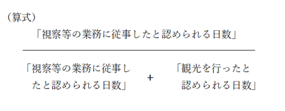 ※1業務従事割合 上述の「業務従事割合」は、旅行日程を①「視察等(業務に従事したと認められる日数)」、②「観光(観光を行ったと認められる日数)」、③「旅行日」及び④「その他」に区分し、次の算式により計算した割合をいいます。