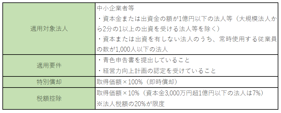 青色申告書を提出する中小企業者等が、 2025年3月31日までに、中小企業等経営強化法の認定を受けた経営力向上計画に基づき一定の設備を新規取得等して指定事業の用に供した場合には、 即時償却または 取得価額の10%(資本金3,000万円超1億円以下の法人は7%)の税額控除を選択適用することができます。適用要件等