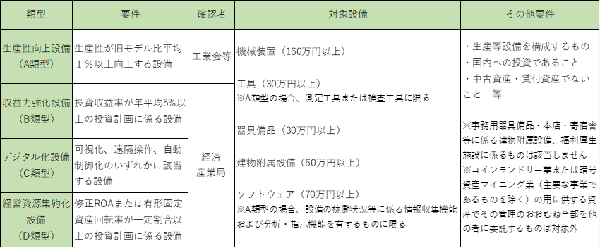 適用対象資産である「経営力向上設備等」は、以下4つの類型に区分されます。