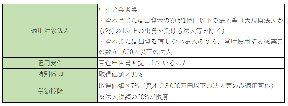 青色申告書を提出する中小企業者等が、 2025年3月31日までに新品の機械装置等を取得等して、指定事業の用に供した場合、 取得価額の30%の特別償却を適用できます。また、特定中小企業者等(資本金3,000万円以下の法人等)では、 特別償却または 取得価額の7%の税額控除を選択適用できます。適用要件等