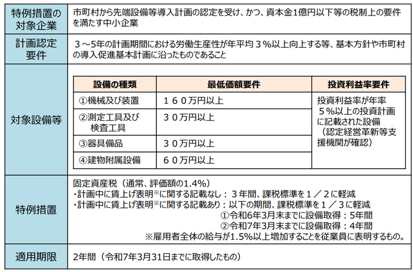 この制度の適用対象となる指定事業は、次に掲げる事業です。 製造業、建設業、農業、林業、漁業、水産養殖業、鉱業、採石業、砂利採取業、卸売業、道路貨物運送業、倉庫業、港湾運送業、ガス業、小売業、料理店業その他の飲食店業(料亭、バー、キャバレー、ナイトクラブその他これらに類する事業にあっては、生活衛生同業組合の組合員が行うものに限ります。)、一般旅客自動車運送業、海洋運輸業、沿海運輸業、内航船舶貸渡業、旅行業、こん包業、郵便業、情報通信業、損害保険代理業、不動産業、駐車場業、物品賃貸業、学術研究、専門・技術サービス業、宿泊業、洗濯・理容・美容・浴場業、その他の生活関連サービス業、映画業、教育、学習支援業、医療、福祉業、協同組合(他に分類されないもの)およびサービス業(他に分類されないもの) ※娯楽業(映画業を除く。)、性風俗関連特殊営業に該当する事業は対象外生産性向上や賃上げに資する中小企業の設備投資に関する固定資産税の特例措置