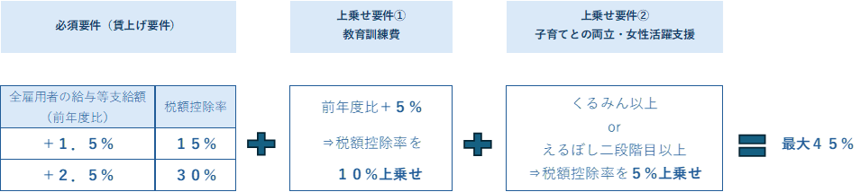 ※必須要件(賃上げ要件)・上乗せ要件①・上乗せ要件②のすべての要件を満たせば、最大45%の税額控除が可能となります(2024年3月31日以前に開始した事業年度については最大40%。)。 - 税額控除額の上限:法人税額の20%(税額控除率に基づいて算出した金額が法人税額の20%を超える場合には、法人税額の20%が税額控除額となります。)