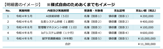 教育訓練費増加要件を満たしている場合でも、教育訓練費の上乗せ措置の適用を受けるためには、以下の事項を記載した教育訓練費の明細書を作成して保存しておく必要があります。税務申告書への添付等は必要ありませんが、税務調査等で確認を受ける可能性がありますので、適用を受ける場合には忘れずに作成しておきましょう。 ① 教育訓練等の実施時期:「年月」は必須、「日」は任意で記載 ② 教育訓練等の実施内容:教育訓練等のテーマや内容及び、実施期間 ③ 教育訓練等の受講者 :教育訓練等を受ける予定、または受けた者の氏名等 ④ 教育訓練費の支払証明:費用を支払った年月日、内容及び金額並びに相手先の氏名または名称が明記された領収書の写し等