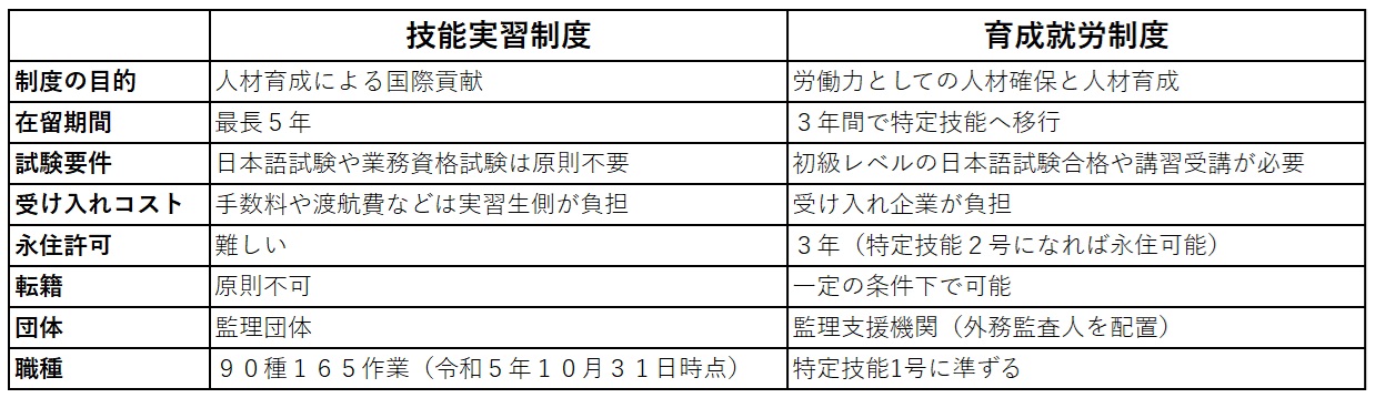 技能実習制度が我が国での技能等の修得等を通じた人材育成により国際貢献を行うことを目的とする制度であるのに対し、育成就労制度は、我が国の人手不足分野における人材育成と人材確保を目的とする制度であり、制度の目的が異なります。 そして、このような制度目的の違いを踏まえ、育成就労制度では、外国人を労働者としてより適切に権利保護するという観点から、技能実習制度では認められなかった外国人本人の意向による転籍を一定の条件の下で認めることに加え、受入れ対象分野を特定産業分野(生産性向上や国内人材確保を行ってもなお外国人の受入れが必要な分野)のうち就労を通じて技能を修得させることが相当なものに限り、原則3年間の就労を通じた人材育成によって特定技能1号の技能水準の人材を育成することを目指すものとしています。