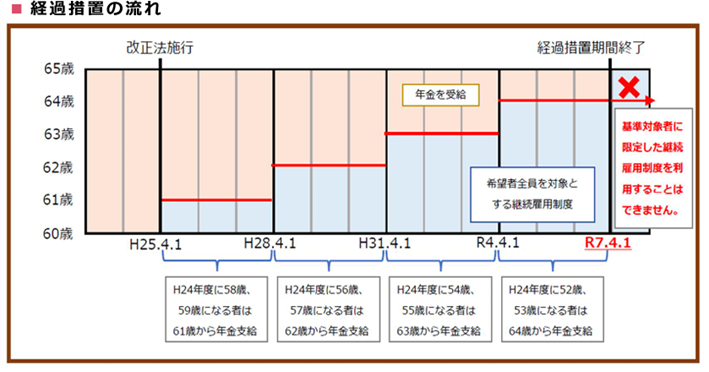 なお、経過措置終了前の就業規則において、経過措置終了後には希望者全員を65歳まで継続雇用する旨が定められていない場合は、経過措置終了に伴い、就業規則の変更が必要となります。