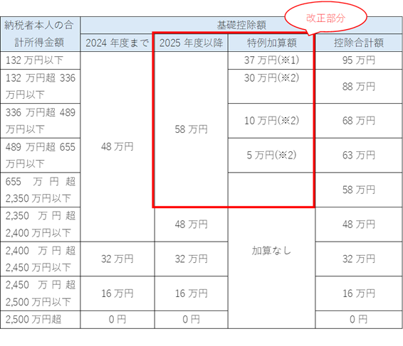 合計所得金額2,350万円以下の場合の基礎控除額が、48万円から58万円に10万円引き上げられました。 さらに年収に応じて基礎控除の額を加算する「基礎控除の特例」が創設され、所得金額が132万円以下の場合の基礎控除額は、37万円加算され、95万円となりました。 <基礎控除の改正内容>★所得132万円以下の方は基礎控除が95万円に!★