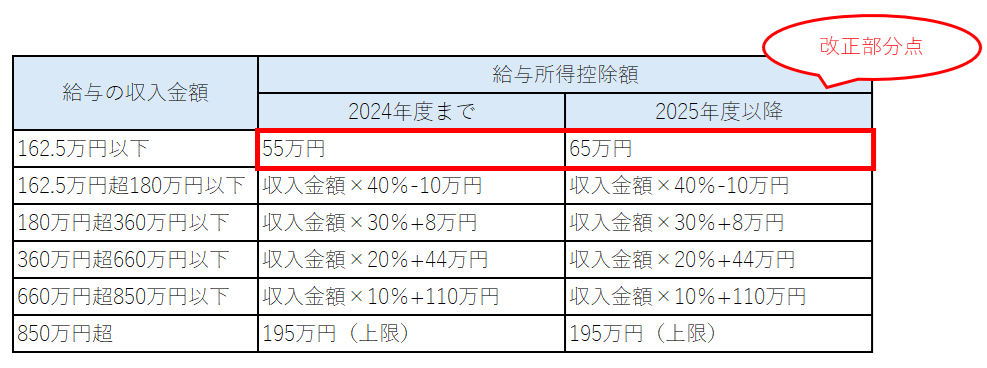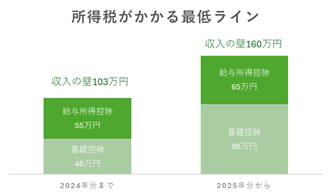 上記の基礎控除と給与所得控除の改正により、2025年分からは、所得税がかかり始める年収が103万円から160万円に引き上げられました。これが所得税がかかり始める最低ライン「年収160万円の壁」になります。