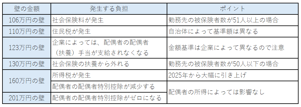 2025年からの所得税・住民税・社会保険の年収の壁をまとめると、次のようになります。 <2025年からの年収の壁>