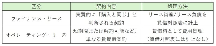 中小企業においては、ファイナンス・リースのうち所有権移転外ファイナンス・リースはオペレーティング・リースと同様に賃借料として費用処理することが認められており、実務的に